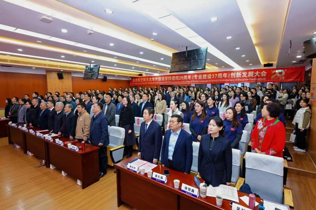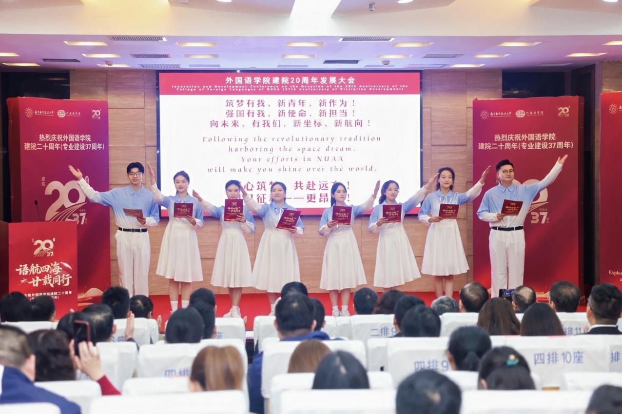 南京航空航天大学校长助理潘时龙教授,外国语学院历任院领导,曾在外国语学院学习或工作过的领导、兄弟学院领导、院友代表、学院教职工及学生代表出席大会。全球校友、广大师生、社会各界朋友通过网络平台观看大会直播,共同庆祝学院建院二十周年。
