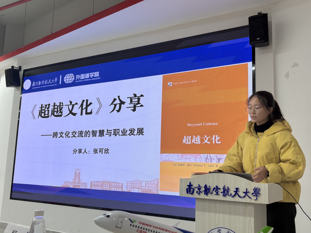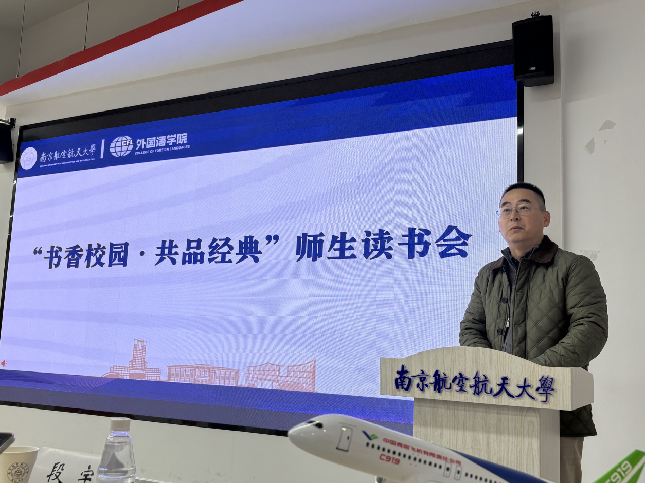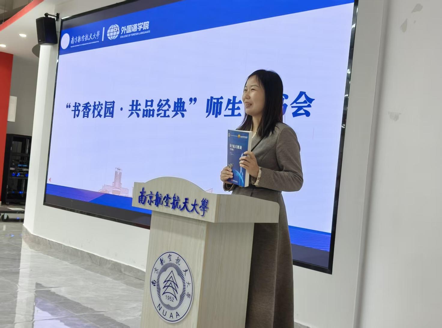 随后,“书香校园·共品经典”师生读书会环节,范浩院友结合学生时代的求学历程与创业路上的实战感悟,强调了“胸怀大志”与“脚踏实地”并重的人生哲学,并在互动环节中与同学们真诚交流,为在座学子带来深刻启发。此外,范浩院友向在座学生推荐了《The CultureMap》一书,希望后辈学子们从中找到一把解锁文化差异、提升跨文化沟通力的钥匙。葛建平院友娓娓道来她与《航空航天概论》的故事以及在出版行业的职业体悟,展现出知识传播者的责任与情怀。两位院友的倾情分享,真挚而充满力量,赢得了全场热烈的掌声。外国语学院2025级英语复合创新班的张可欣同学分享了《超越文化》一书的阅读体悟。她从理论框架延伸到现实案例,并结合外语人的职业路径展开深入思考,充分展现了外院学子对文化差异的敏锐感知以及将语言能力转化为跨文化实践的应用潜力。