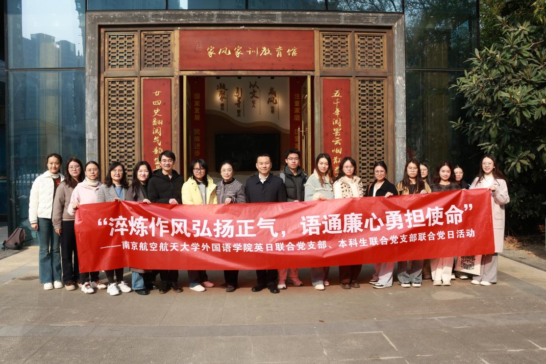 为深入学习贯彻党的二十大及二十届历次全会精神,全面落实学校第六届“清廉南航”宣传教育周工作部署,巩固拓展主题教育成果,持续深化学院党风建设,2025年12月11日,南京航空航天大学外国语学院英日联合党支部、本科生联合党支部于雨花区古雄街道廉政教育基地联合举办“淬炼作风弘扬正气,语通廉心勇担使命”主题党日活动。学院党委书记庄群华、党委副书记吴科颖、组织员杨定娟、本科生辅导员冯子格共同参与活动。