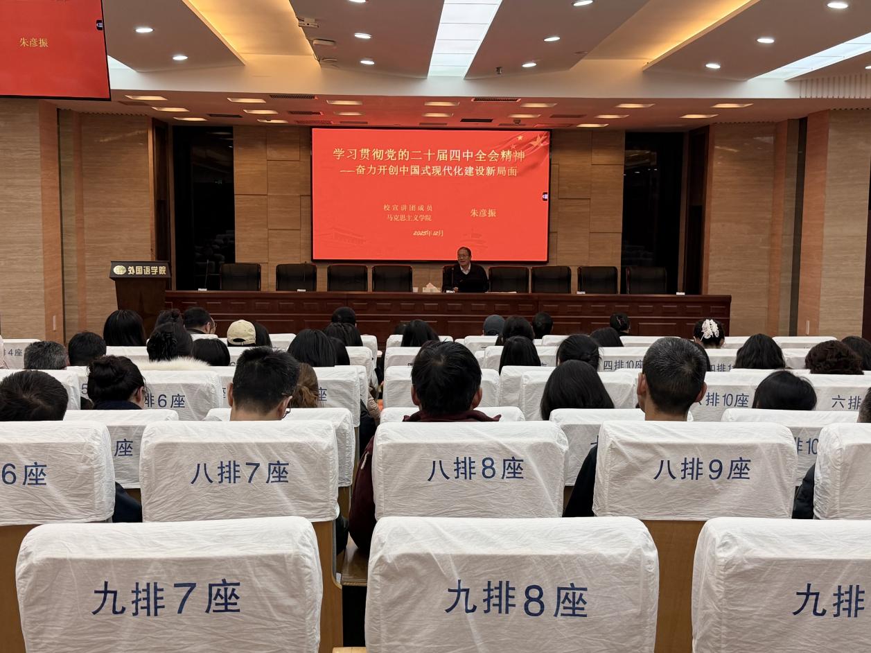 为深入学习贯彻党的二十届四中全会精神,12月26日,外国语学院举行学习贯彻党的二十届四中全会精神校内宣讲团报告会。本次报告会邀请校内宣讲团成员、马克思主义学院朱彦振教授作辅导报告。学院全体领导班子成员、教职工参会学习。报告会由学院党委书记庄群华主持。